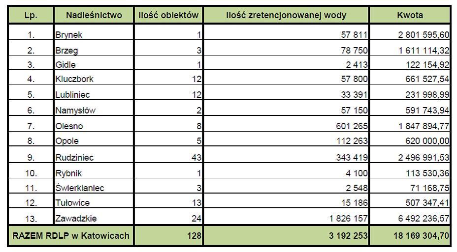 W ramach projektu małej retencji nizinnej nadleśnictwa zrealizowały 3644 obiekty, retencjonujące ponad 42 mln m³ wody. To ponad 10 mln m³ więcej niż pierwotnie planowano.